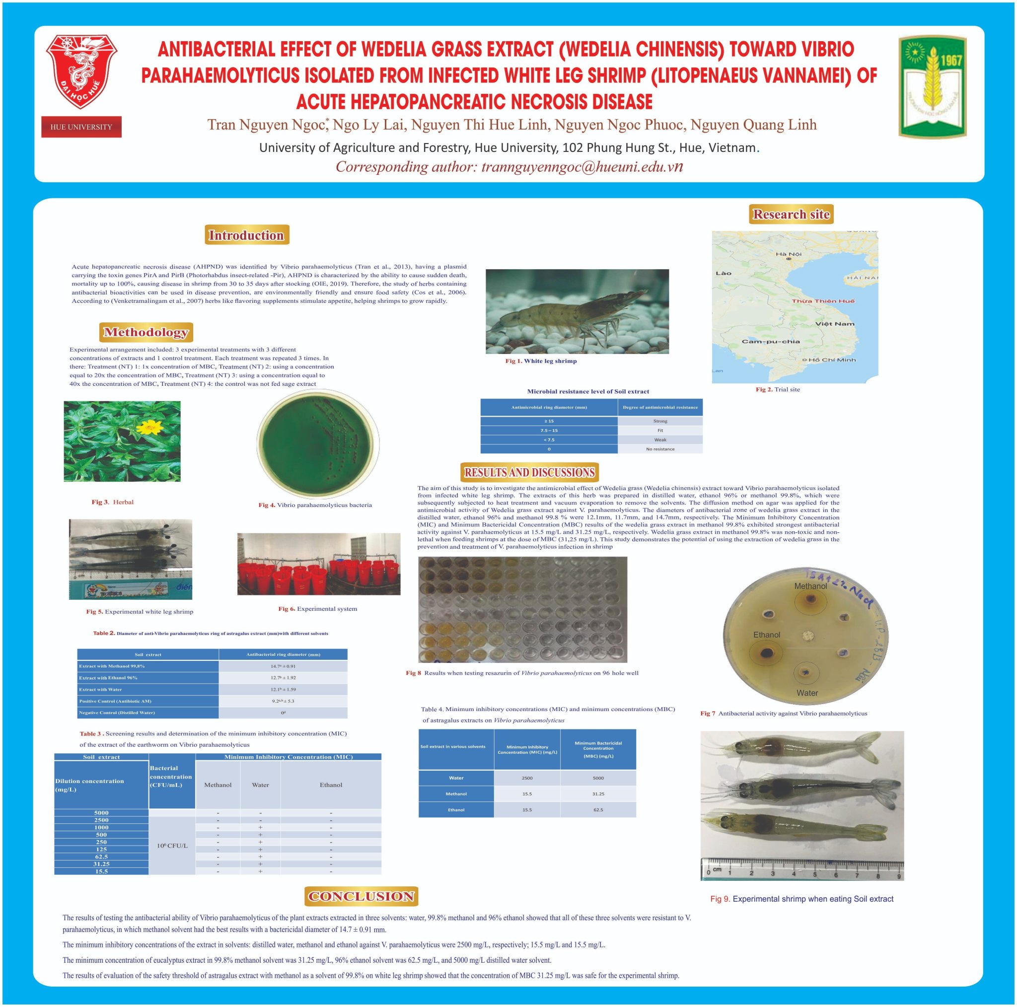 | Tên bài báo: | Antibacterial effect of wedelia grass extract (wedelia chinensis) toward vibrio parahaemolyticus isolated from infected white leg shrimp (litopenaeus vannamei) of acute hepatopancreas necrosis disease. | ||||||||||||||
