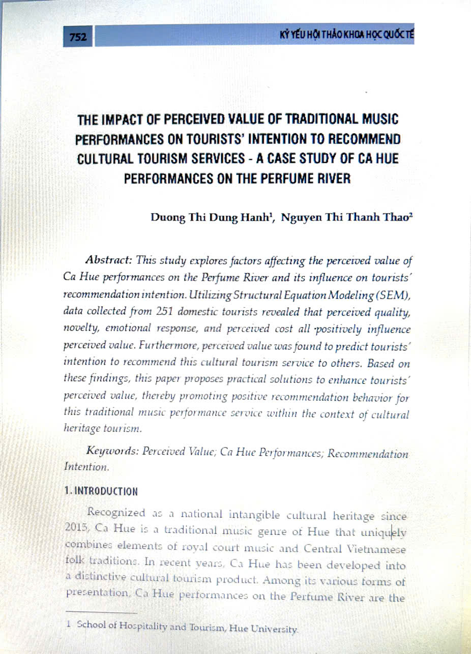 | Tên bài báo: | The impact of perceived value of traditional music performances on tourists’ intention to recommend cultural tourism services - a case study of Ca Hue performances on the Perfume river | ||||||||||||||